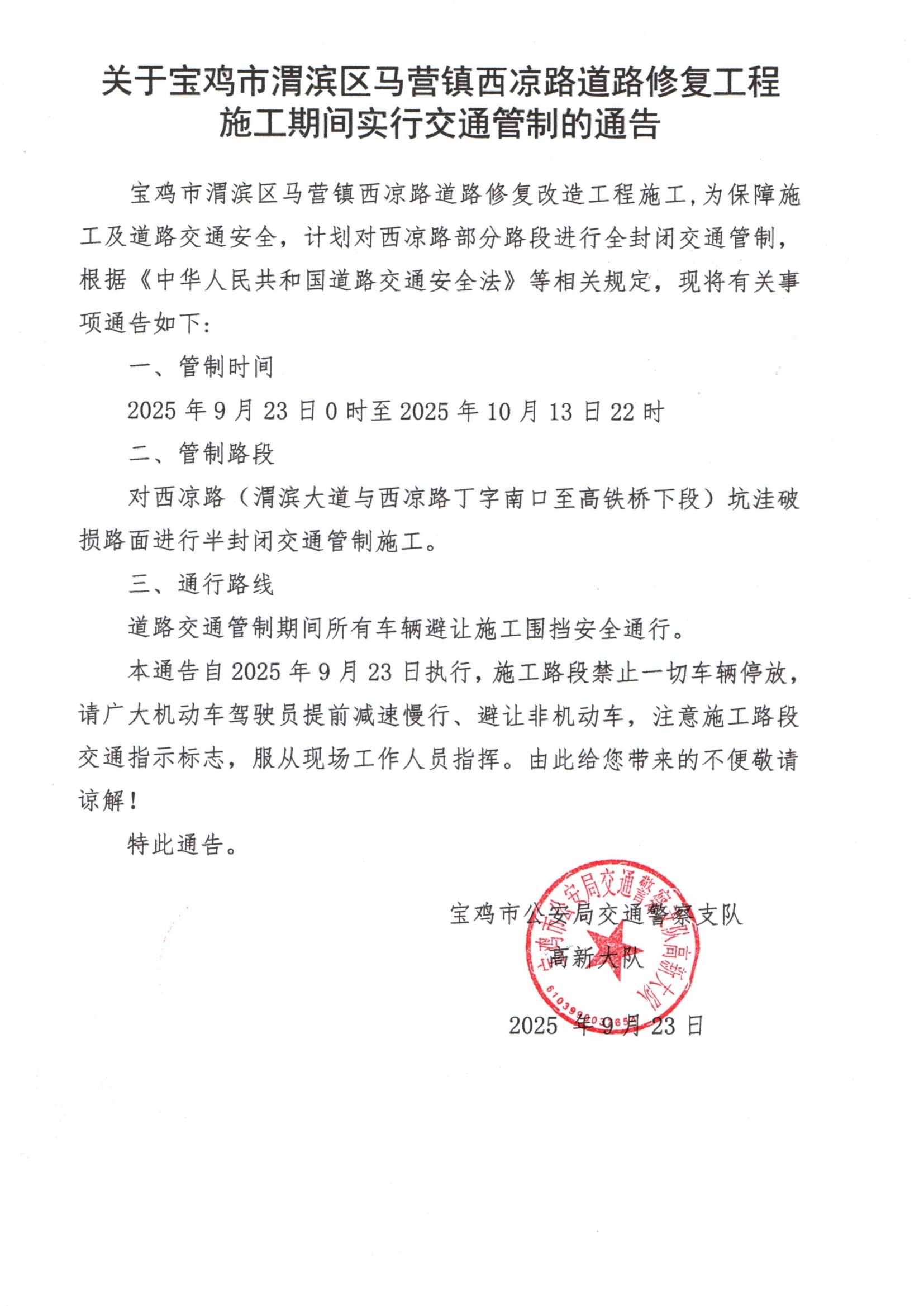 关于宝鸡市渭滨区马营镇西凉路道路修复工程施工期间实行交通管制的通告