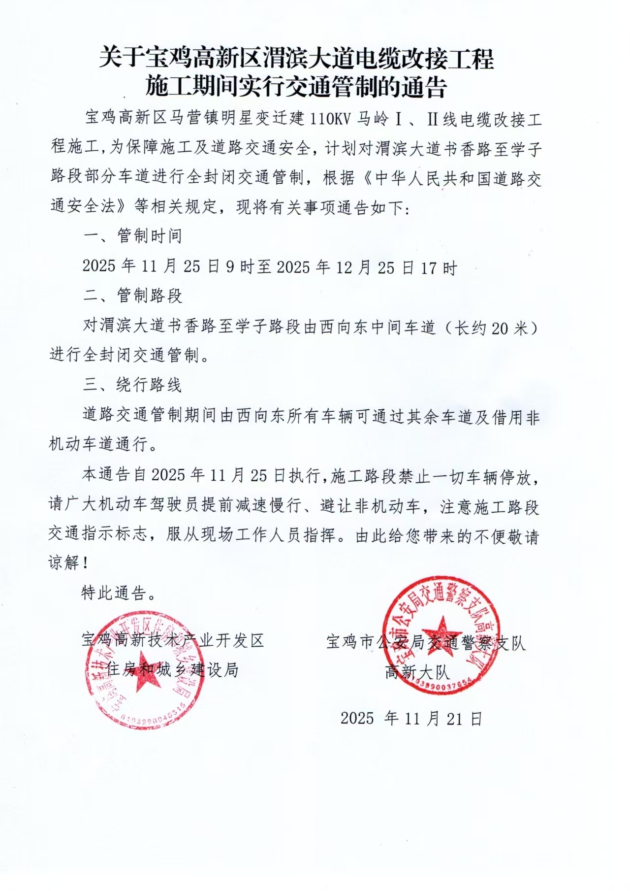 关于宝鸡高新区渭滨大道电缆改接工程施工期间实行交通管制的通告