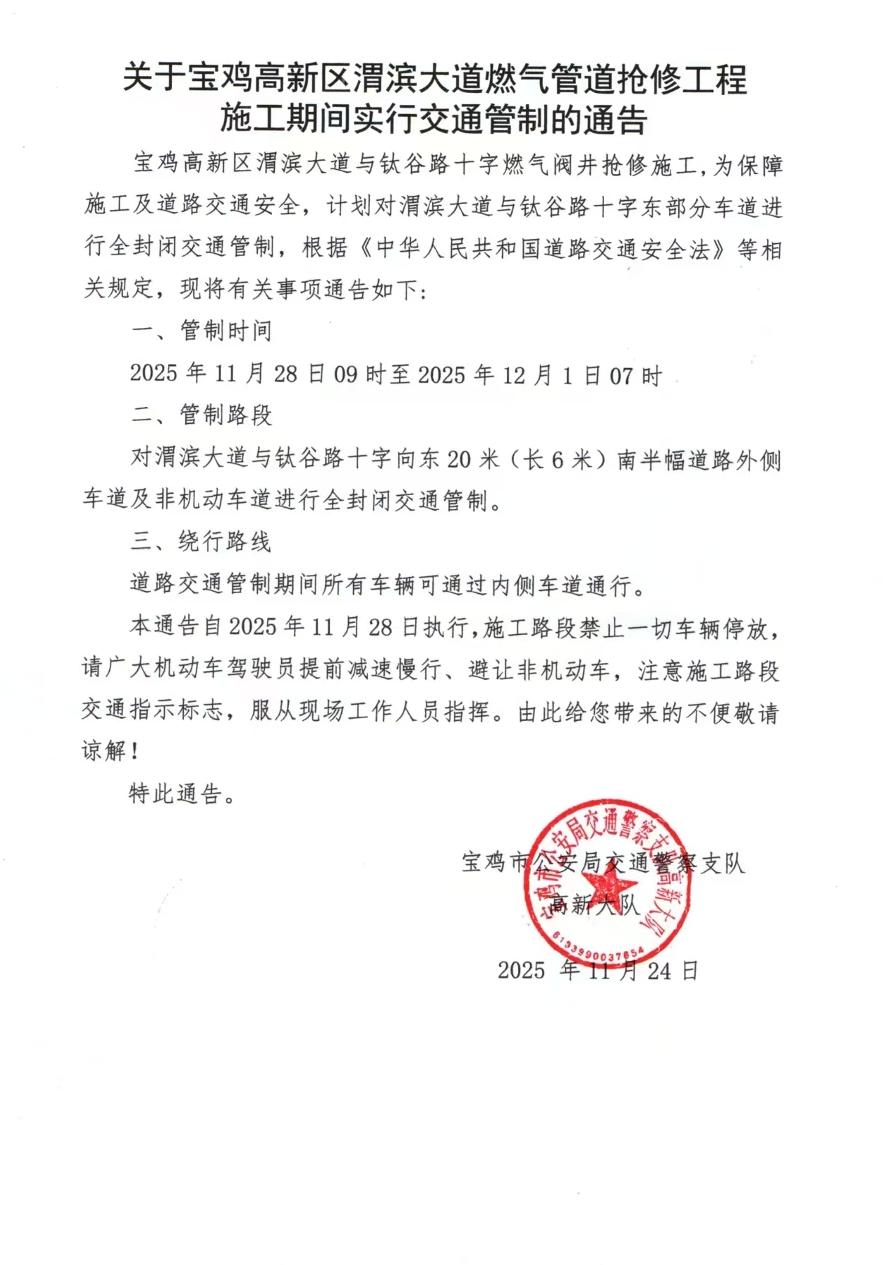 关于宝鸡高新区渭滨大道燃气管道抢修工程施工期间实行交通管制的通告