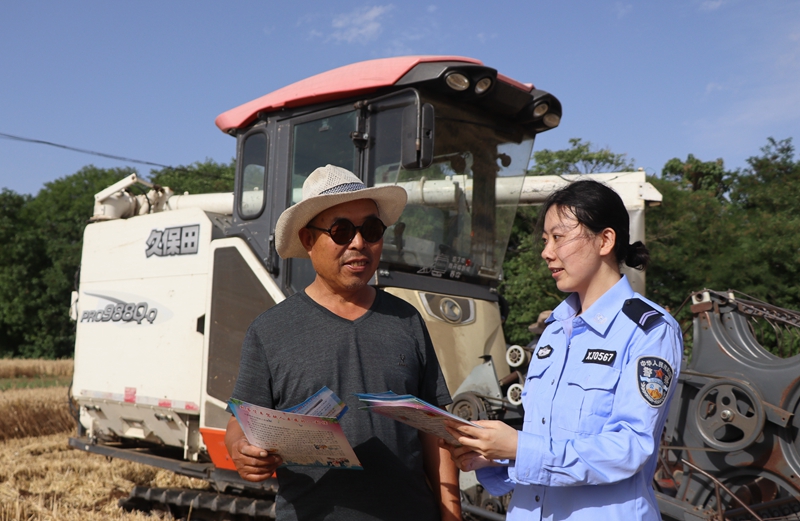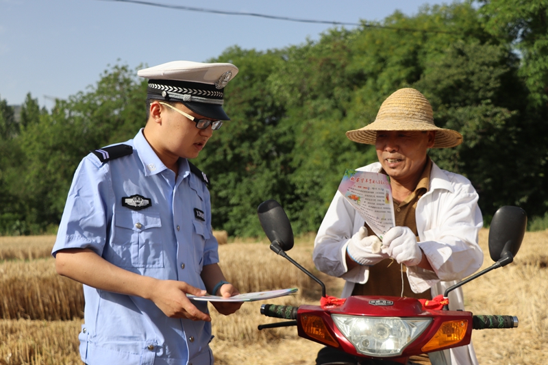 在凤鸣镇北吴邵村李家道,民警走进田间地头,零距离与群众交流。并通过近年来身边人、身边典型交通事故案例,以案说法,宣讲交通小陋习可能引发的大事故,提醒群众注意夏收农机操作安全,严禁焚烧秸秆、严禁农用车载人、严禁两轮电动车载货。提醒村民在售卖粮食时注意驾车安全,严禁超载,严禁人货混载,严防拖拉机载人。夏收时注意劳逸结合,严防疲劳驾驶车辆,严防交通事故发生。