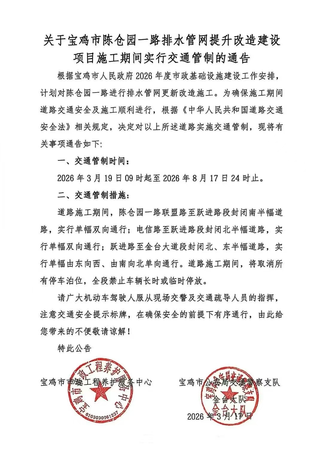 关于宝鸡市陈仓园一路排水管网提升改造建设项目施工期间实行交通管制的通告