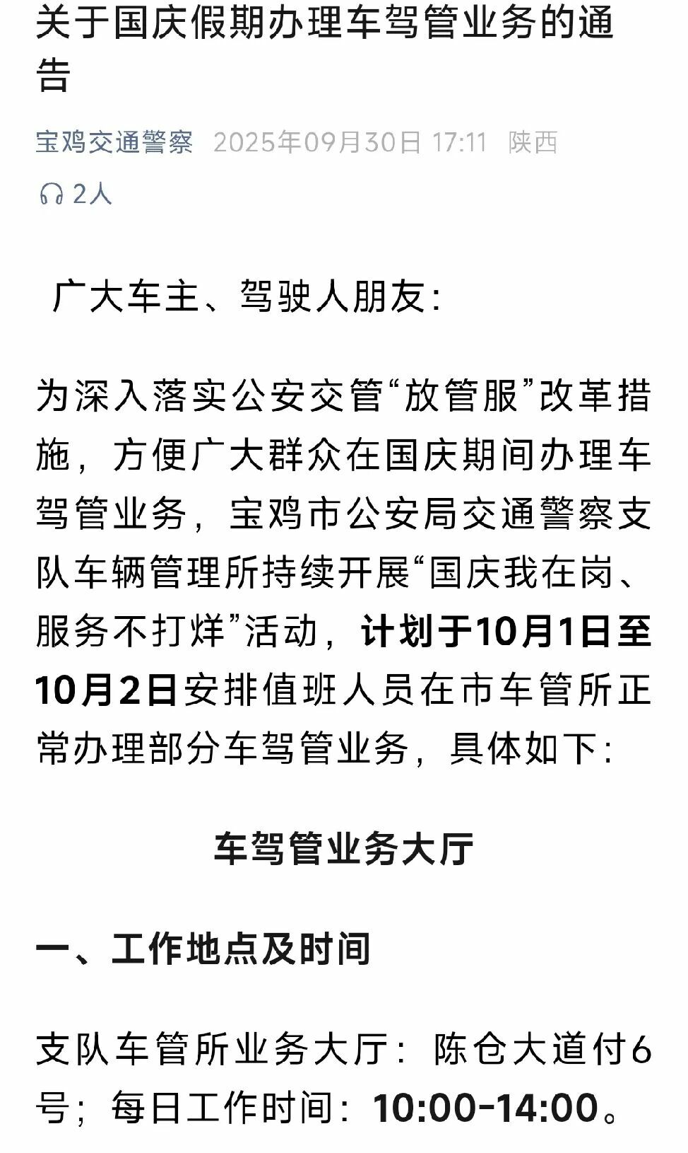 国庆期间,宝鸡交警支队车管所坚持"服务不打烊、我在岗守护",推出系列便民利企举措。服务窗口每日安排专人值守,照常办理机动车牌证补换领、解抵押和驾驶证补换领、年检标申领等各类业务,确保群众"随时来、随时办"。同时大力推行“线上+线下”服务模式,积极引导群众使用“交管12123”APP办理业务,让数据多跑路、群众少跑腿。节日期间,共接待群众咨询办理业务100余人次,线上办理业务150余件,实现了"群众过节、交警在岗"的服务承诺。