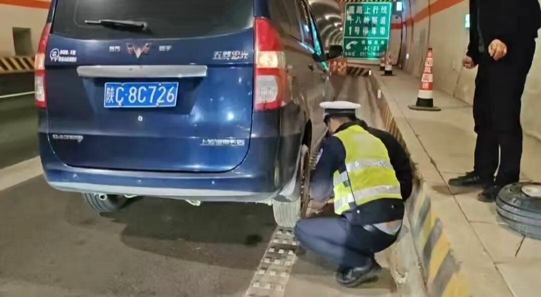 10月3日17时10分,正值出行高峰,宝鸡高速交警在巡逻至十八岭隧道时,发现一辆小型客车因爆胎停滞在紧急停车带。执勤民警立即启动应急响应,设置安全警示区,引导后方车辆避让同时,在车流中熟练操作,仅用10分钟就完成换胎作业。这样的暖心救援每天都在上演。