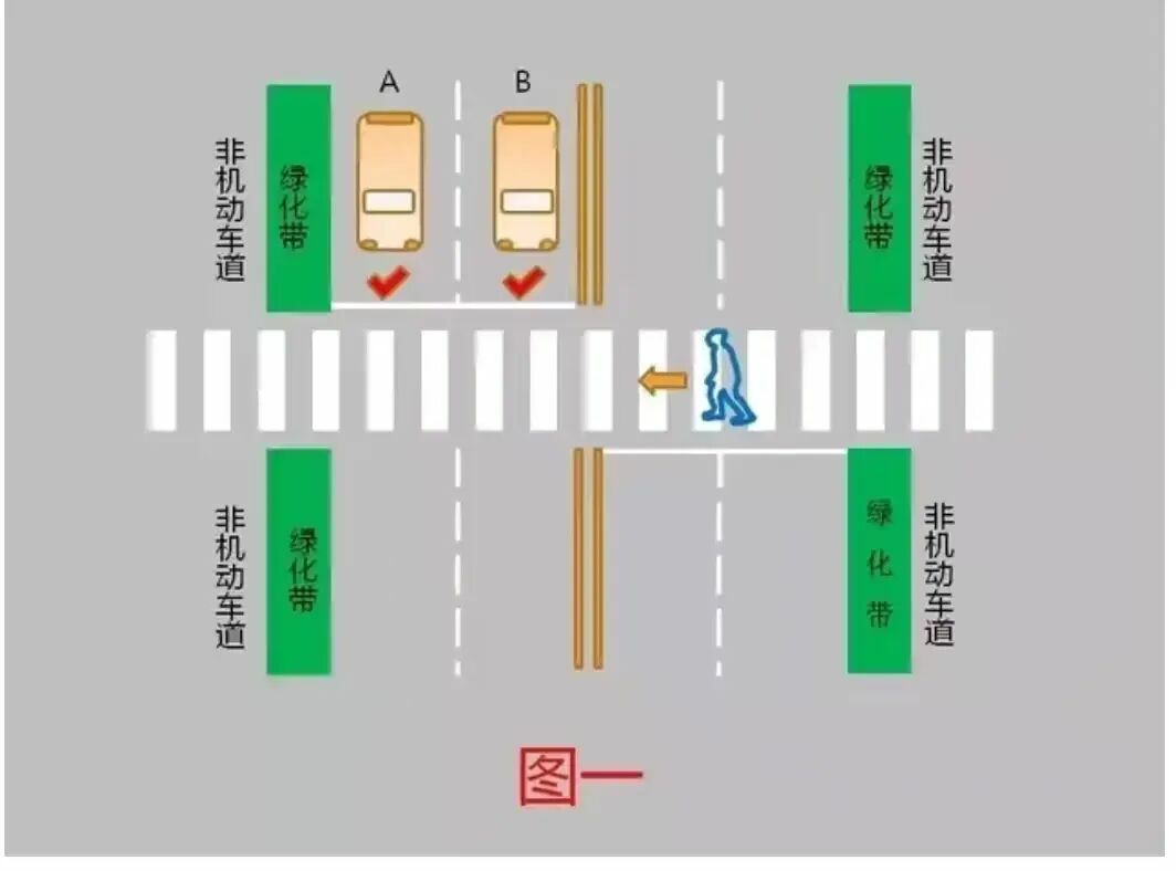 1、行人在道路右幅人行横道行走、未抵达道路中心线时,在左幅道路行驶的机动车A、B应当减速行驶,可在确保安全的前提下通过人行横道。(图一)