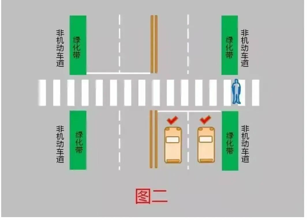 2、行人在机动车道、非机动车道分隔线外侧等待,未进入机动车道,机动车A、B应当减速行驶,可在确保安全前提下通过人行横道。(图二)