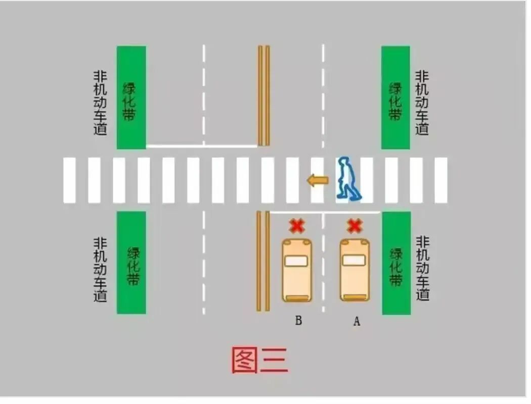 3、行人越过机动车道、非机动车道分隔线,进入上述位置,机动车A、B未停车让行的,属于违法行为,应当处罚。(图三)