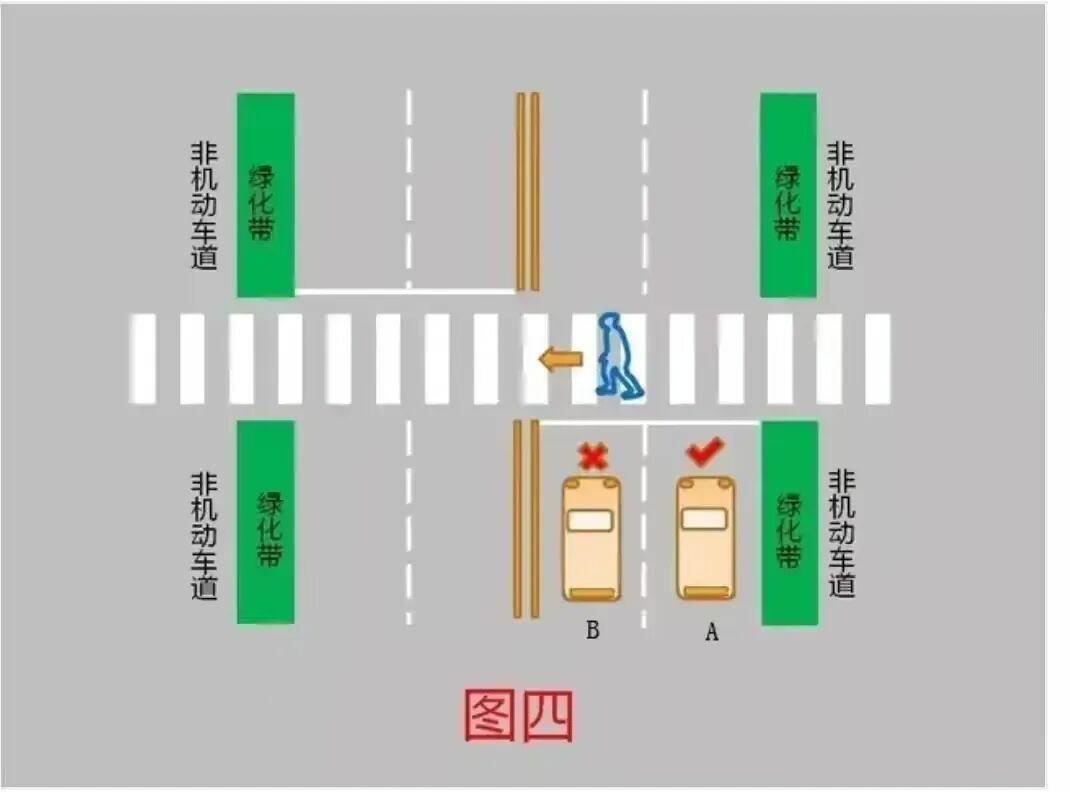 4、行人沿人行横道进入机动车B所在的车道后,机动车A应当减速行驶,可在确保安全前提下通过人行横道;机动车B未停车让行的,属于违法行为,应当处罚。(图四)