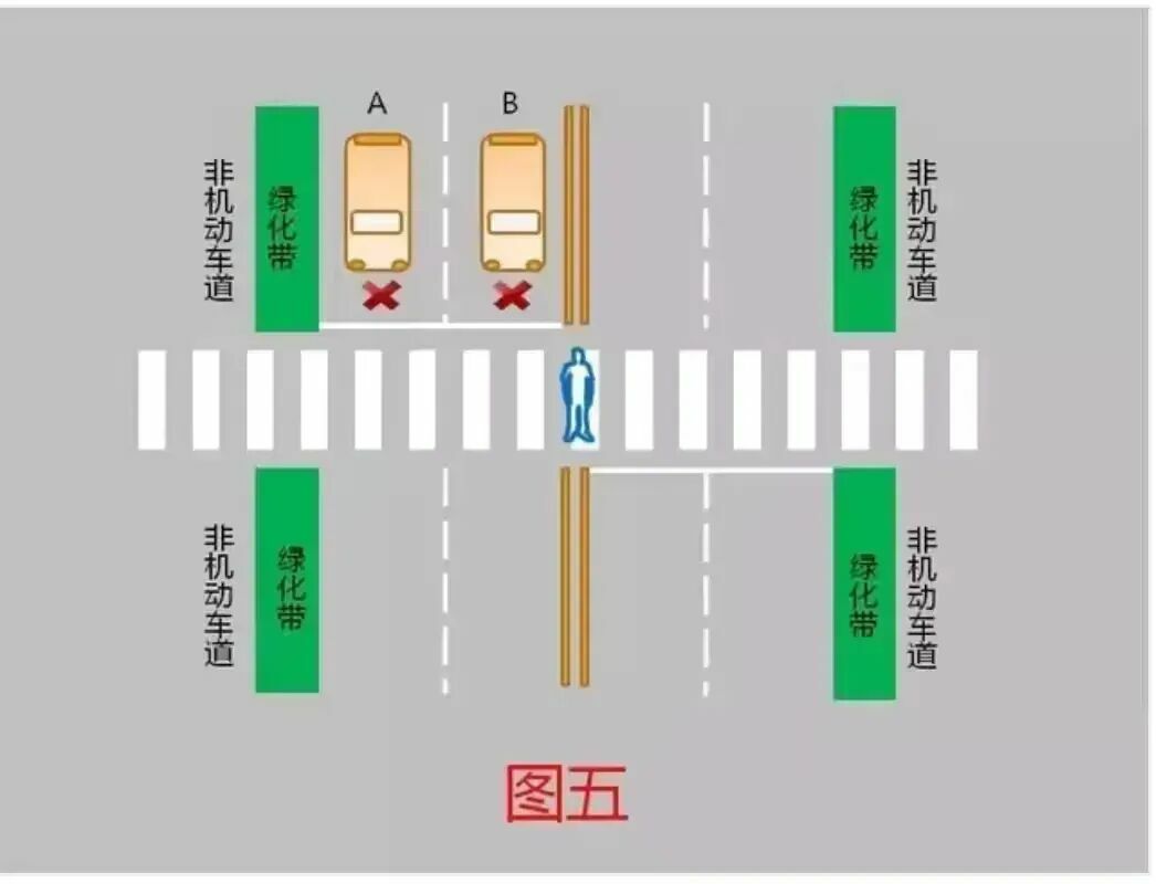 5、行人在道路中心线等待、未进入机动车A、B所在车道,机动车A、B未停车让行的,属于违法行为,应当处罚。(图五)