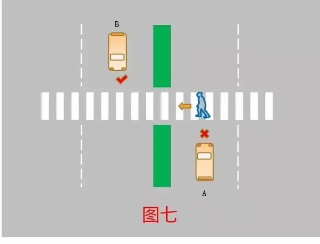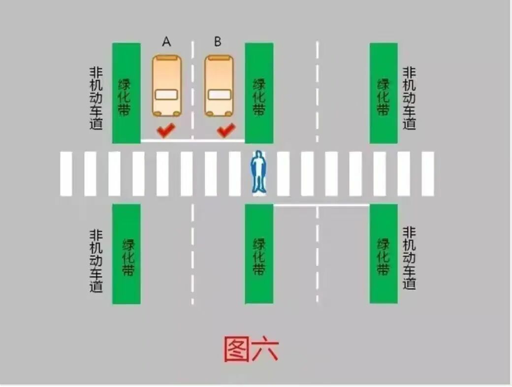 6、道路中央采用绿化带隔离,行人在道路中央驻足区等待的,机动车A、B应当减速行驶,可在确保安全的前提下通过人行横道。(图六)