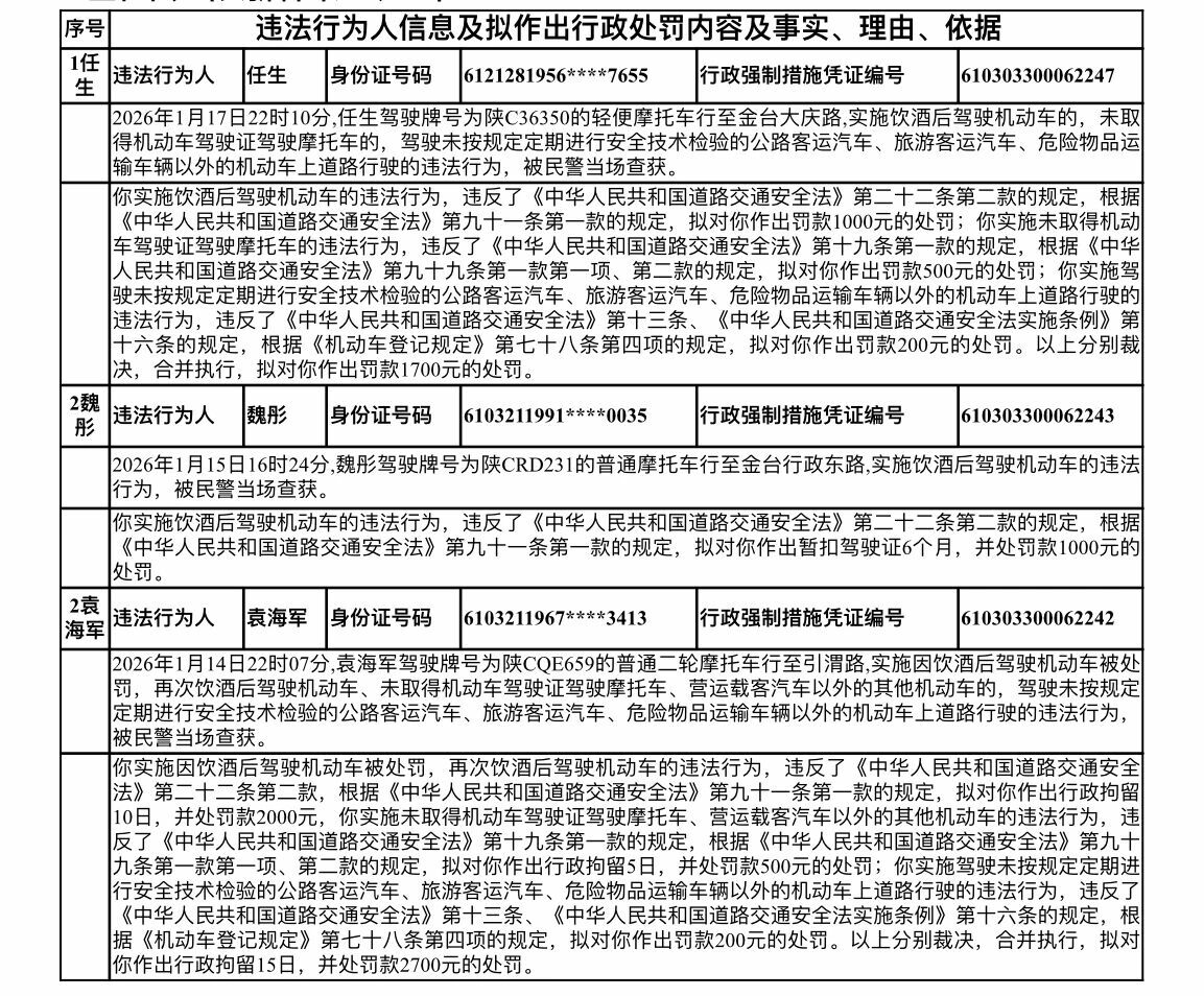 以下任生等3名机动车驾驶人违反道路交通安全法律法规,未在法定期限内接受处理,经我大队多次催告至今仍未接受处理。依据《中华人民共和国行政处罚法》第四十四条的规定,现将拟作出行政处罚决定的事实、理由、依据告知如下: