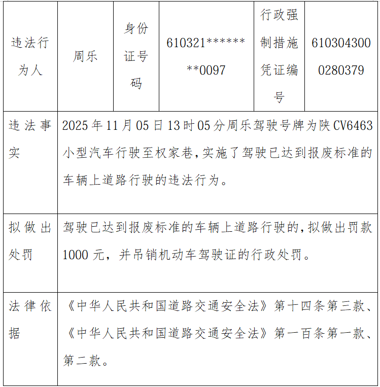 机动车驾驶人周乐,因道路交通安全违法行为被宝鸡市公安局交通管理支队陈仓大队查获,其违法事实清楚、证据确实充分,依法应当予以处罚,经我大队多次催告至今仍未接受处理,依据《公安机关办理行政案件程序》第一百六十八条的规定,现采取公告的方式予以告知。