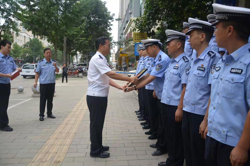 闫锦生现场宣读了表彰决定,张怀顺代表市局党委对支队渭滨大队战时立功表示祝贺,对全体民辅警在抢险救灾工作中展现出的担当精神给予了充分肯定,并向大队全体进行慰问。他表示,“7.16”强降雨导致渭滨辖区多条道路被淹,城区内涝严重,险情发生后,大队全体领导干部能全时坚守带头冲锋,全警陈兵一线,封闭道路、疏导交通、帮助涉水车辆、抢救被困群众,用实际行动展现了公安交警的使命担当。希望全体民辅警珍惜荣誉、再接再厉、顽强拼搏,全力做好灾后道路应急保障各项工作,全力以赴守护辖区道路平安畅通,为坚决打赢汛期道路交通管理攻坚战再立新功。