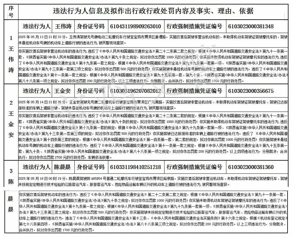 以下王伟涛等3名机动车驾驶人违反道路交通安全法律法规,未在法定期限内接受处理,经我大队多次催告至今仍未接受处理。依据《中华人民共和国行政处罚法》第四十四条之规定,现将拟作出行政处罚内容及事实、理由、依据告知如下: