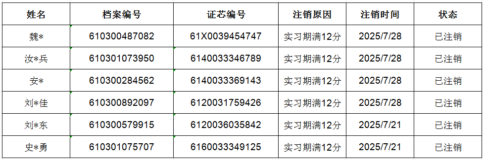根据《机动车驾驶证申领和使用规定》(公安部172号令)第八十条之规定,下列机动车驾驶人因在实习期内发生的道路交通安全违法行为被记满12分,应当注销其实习的准驾车型驾驶资格。现依法注销其实习的准驾车型驾驶资格,并公告作废。