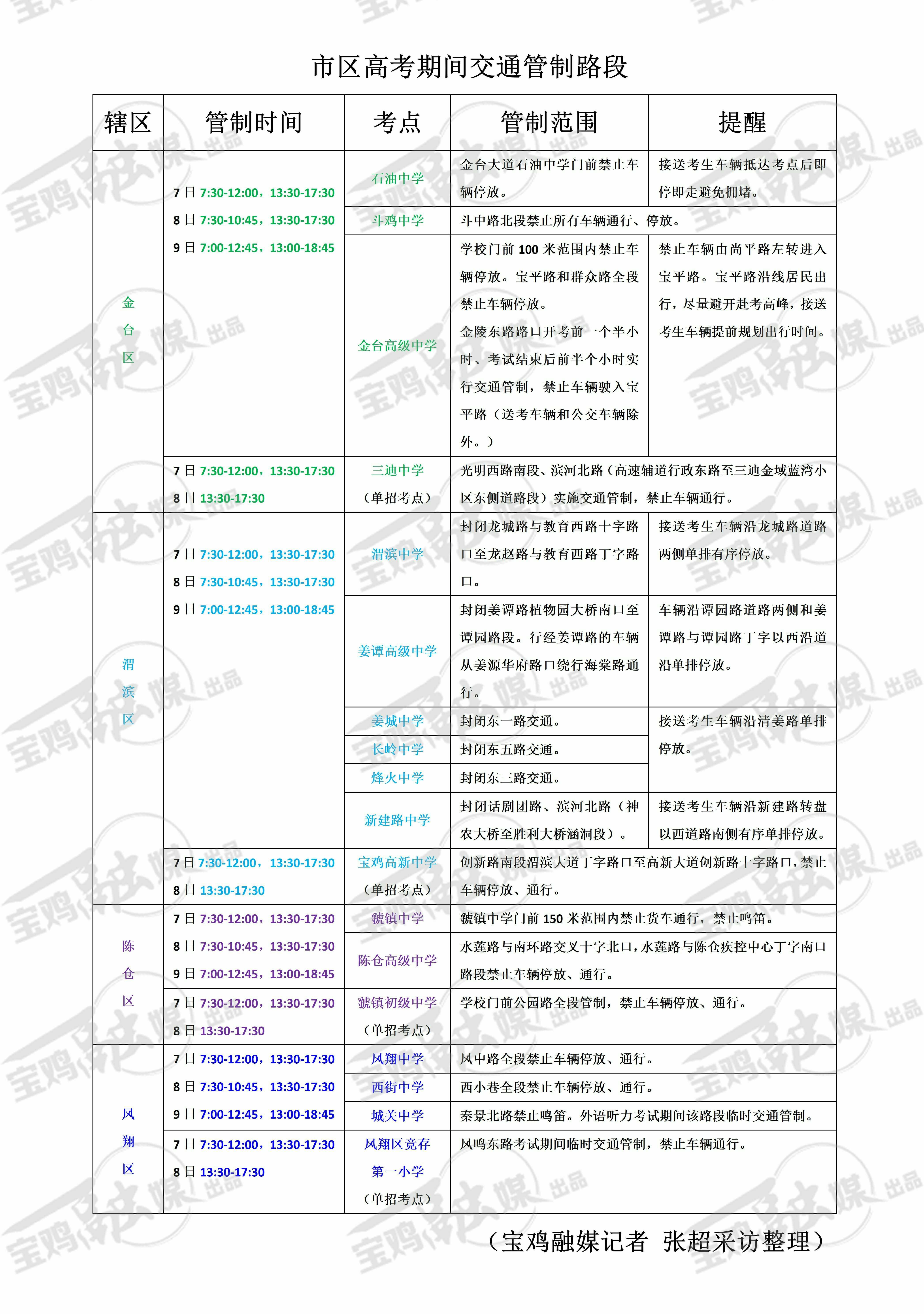 今年高考,宝鸡市区共有18个考点,其中,金台区:石油中学、斗鸡中学、金台高级中学、三迪中学共4个,渭滨区:渭滨中学、烽火中学、长岭中学、姜城中学、姜谭高级中学、新建路中学、宝鸡高新中学共7个,陈仓区:虢镇中学、陈仓高级中学、虢镇初级中学3个考点,凤翔区:凤翔中学、西街中学、城关中学、凤翔区竞存第一小学共4个考点。