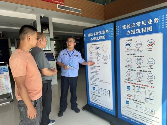 一是营造文明交通氛围。在车管所大厅摆放《道路交通安全常识》、《常见交通指挥手势的含义》《新手司机必看交通标志攻略》《驾驶证、机动车常见业务办理流程图》《掌握10大骗术,远离非法中介》等宣传彩页和宣传展板,并通过集中讲解和个别指导相结合的方式提高学员对文明交通安全知识的知晓度。确保学员在学车前能尽可能充分地了解交通安全的法律法规,稳妥选择正规驾校,提高学员交通安全意识,营造文明礼让、和谐顺畅的交通出行环境。