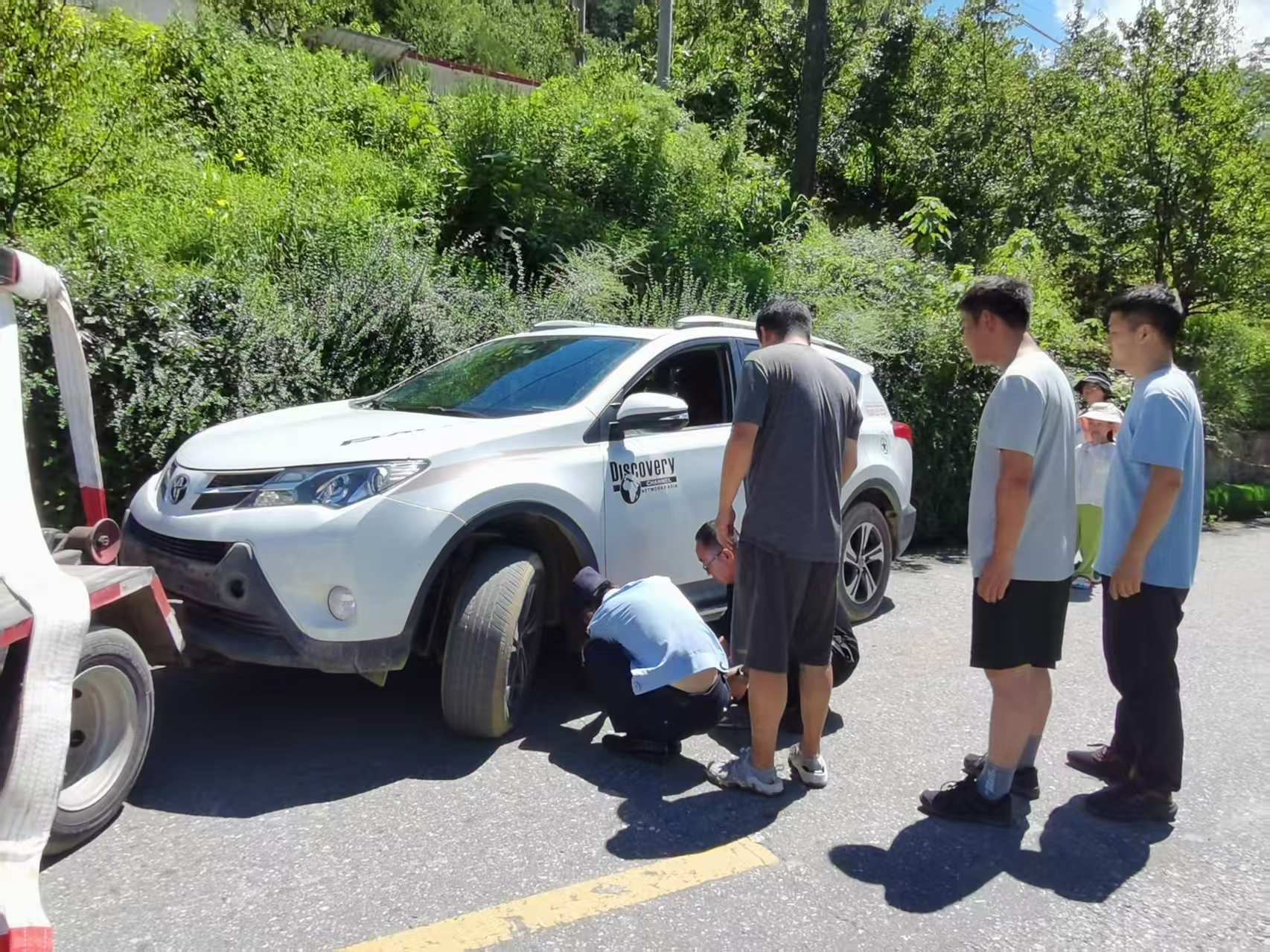 当日11时许,黄柏塬所队民警在通往大箭头景区的公路上执勤时,发现一辆白色私家车打着双闪停在路上,车主正焦急地查看车辆轮胎。民警见状上前询问后得知,车主前往大箭头景区游玩,不料车辆爆胎无法行驶。为了尽快消除安全隐患,民警和游客将车辆推至安全路段并做好后方安全警示措施,随即化身“修车工”,熟练地帮助游客更换车轮。车轮换好后,民警对车辆进行了仔细检查,确保车辆能够安全行驶,并叮嘱游客备用轮胎不能长时间使用,建议尽快到附近修理厂检修,确保行车安全。